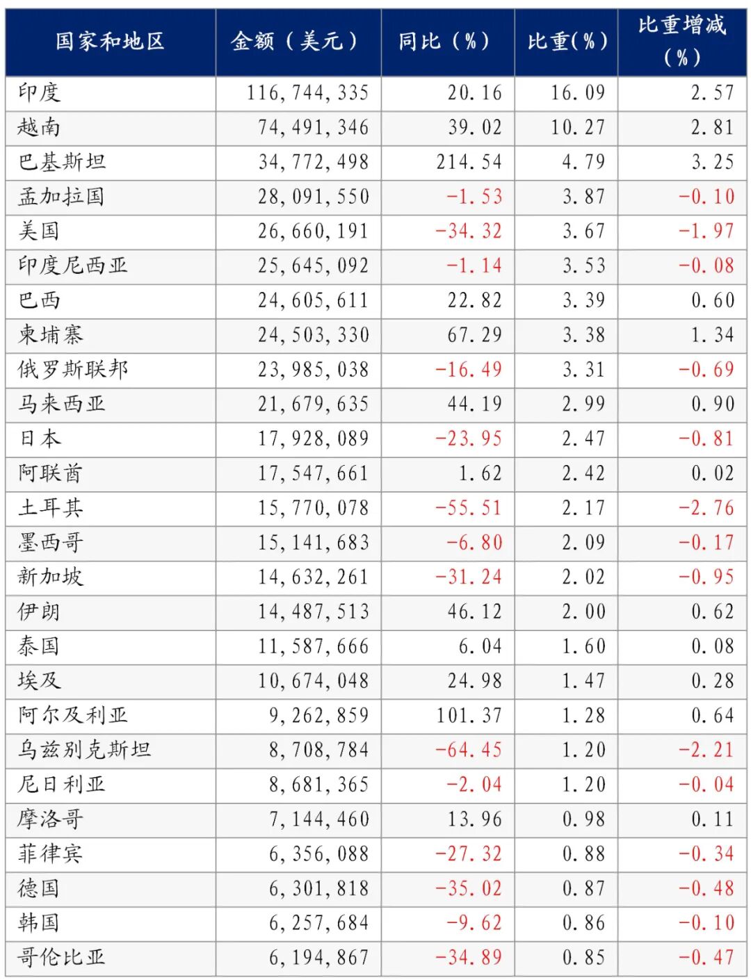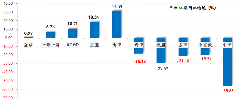 从出口重点区域市场来看,一季度,我国对亚洲、非洲两大市场出口同比均呈现增长态势,而对拉丁美洲、欧洲、北美、大洋洲市场出口均呈同比下滑态势。各区域市场中,我国对“一带一路”市场出口额达5.05亿美元,同比增长6.72%,占行业出口额比重69.63%,比重较上年同期增长3.75个百分点;对RCEP市场出口额2.14亿美元,同比增长10.71%,占行业出口额比重29.44%,比重较上年同期增长2.59个百分点;对南亚市场出口1.88亿美元,同比增长31.91%;对东盟市场出口1.85亿美元,同比增长18.36%;对西亚市场出口6339万美元,同比下降18.18%;对欧盟市场出口3186万美元,同比下降29.57%;对中亚市场出口1853万美元,同比下降55.83%。图8 2024年一季度我国缝制机械产品出口主要地区情况