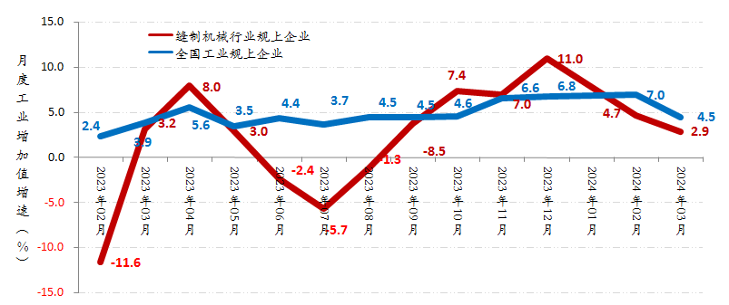 总体来看,一季度全球经济温和复苏,发达国家主动补库,国际贸易明显回暖,我国经济稳步回升,带动了行业内外需较上年明显改善,实现了年初我国缝制机械行业的平稳开局。企业积极增产补库,优化产品结构,效益逐步改善,为全年实现稳中有进、提质增效的发展目标奠定较好基础。展望二季度,全球经济仍将缓慢复苏,但是上下游阶段性补库动力将有所减弱,各项促消费的激励政策效应尚未大幅显现,企业产能过剩状况将逐步凸显,下游需求不足依然是当前制约行业发展的重要阻碍。随着行业上年基数的增高,行业内外销可能将再度走弱,行业经济将呈现阶段性的振荡下行。纵观全年,行业面临的机遇和挑战并存。一方面,全球经济前景有望持续改善,随着高通胀的振荡下行,居民消费能力将逐步恢复,发达国家的补库需求持续释放,东南亚等主要服装生产出口国订单将逐步回升。我国宏观经济持续回升向好,重点发展推进新质生产力,尤其国家出台的超长期国债、房地产新政和《推动大规模设备更新和消费品以旧换新行动方案》等将加快落地显效,将有力拉动投资消费稳步回升。在此背景下,近期国际权威机构小幅上调了中国及世界经济增长预期,我国缝制机械内外贸有望进一步企稳甚至呈现回增;但另一方面,欧美核心通胀仍在持续反复,进一步降低和推迟了降息预期,全球美元荒短期内难以大幅缓解,东南亚国家货币普遍贬值,全球消费需求总体依然偏弱,加之地缘政治冲突越演越烈,国际贸易保护主义加剧,国际航运物流不畅等诸多压力和风险,我国缝制机械行业面临的外部环境依然复杂严峻,行业复苏的基础仍不稳固。行业企业仍需坚持稳中求进总基调,努力化解国际经济环境的不确定性、国内外下游市场需求偏弱以及行业产能过剩内卷加剧等不利影响,充分把握数字化、智能化发展机遇,加大技术创新,开拓新兴市场,推动设备更新,加快转型升级,积极培育发展新质生产力,不断巩固和增强行业经济回升向好态势,推进我国缝制机械现代化产业体系建设。