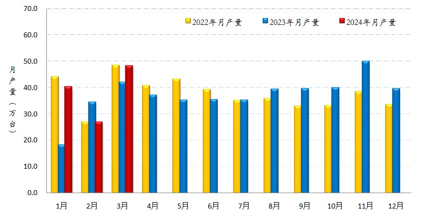 从行业月度以及工业缝纫机生产情况来看,年初行业生产较上年明显增长。1月企业主动补库,积极备货,加大出口,行业百家整机生产企业工业缝纫机产量维持在40.3万台,环比增长1.96%。2月受春节假期因素影响,行业百家企业工业缝纫机产量26.9万台,同比下降21.86%。3月,随着企业全面复工复产、积累订单需求释放和局部区域内外贸市场的逐渐回暖,行业产量继续回升,行业百家企业工业缝纫机产量48.2万台,同比增长13.81%,生产呈现回升向好发展态势。图4 近三年行业百家整机生产企业工业缝纫机月产量情况