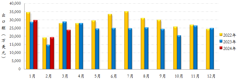 2024年一季度,受海外补库需求释放、国际鞋服市场逐步恢复等拉动,我国缝制机械行业外贸积极恢复,呈现触底回升态势,但短期内持续回升的动力仍显不足。据国家海关数据统计显示,一季度我国缝制机械产品累计出口额7.25亿美元,同比增长0.97%,但仍较2022年同期下降10.79%。从月度出口数据来看,自2023年12月起我国缝制机械行业月出口额增速由负转正。1月行业出口额2.96亿美元,同比增长3.86%,环比增长19.37%;随后2月,受春节假期等因素影响,行业出口额降至1.92亿美元,同比增长30.77%,环比下滑34.99%。3月,在全球通胀反复、资金紧缩的大环境下,印度、美国、孟加拉、印度尼西亚、巴西、俄罗斯、中亚等主要市场需求紧缩,行业出口额2.37亿美元,同比下降17.24%,呈现季末紧缩态势。