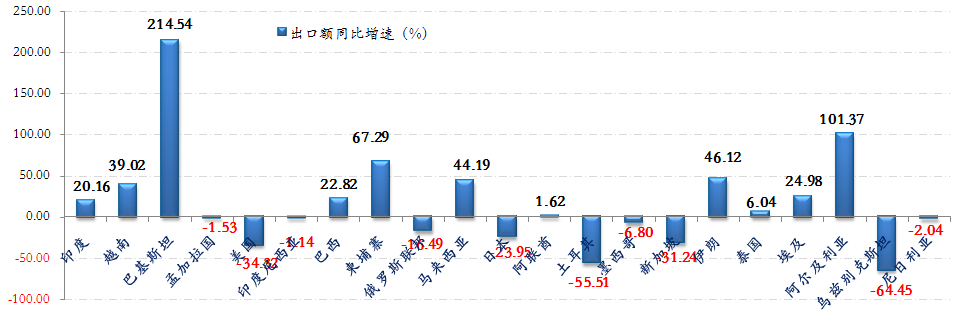 图9 2024年一季度我国缝制机械产品出口主要市场金额增长情况